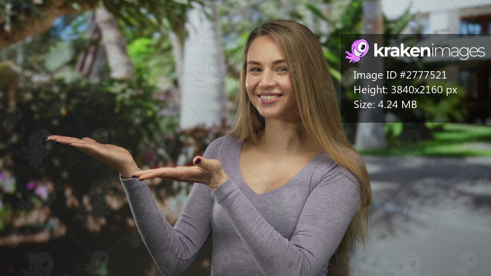 Young woman presenting in lush green park setting outdoors on a sunny day, embodying vibrant youthful energy and joy.
