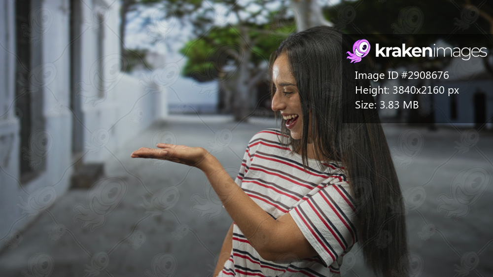 Young woman presenting palm up on a street in city, smiling and offering her hand to the viewer; joy welcome.