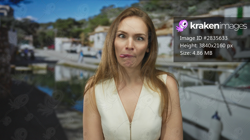 Young woman presses cheeks with fingers at a boat dock in a seaside port while a white yacht floats behind her; amusement playfulness.