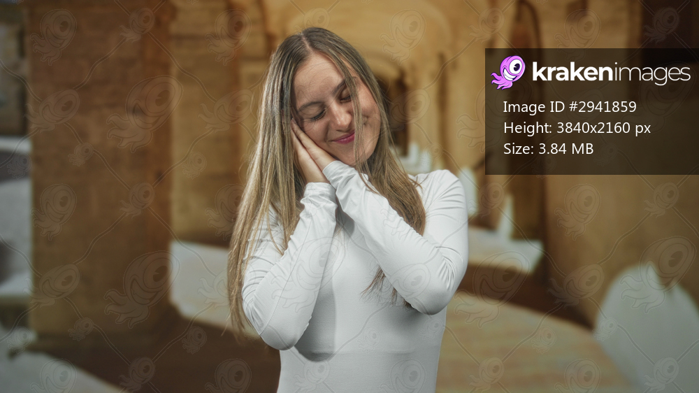 Young woman presses hands to cheek in a sleepy gesture, eyes closed and smiling in an arched historic building; serenity.