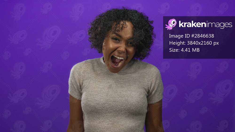 Young woman pressing bare hand to mouth while shouting in vibrant purple studio; celebration excitement.