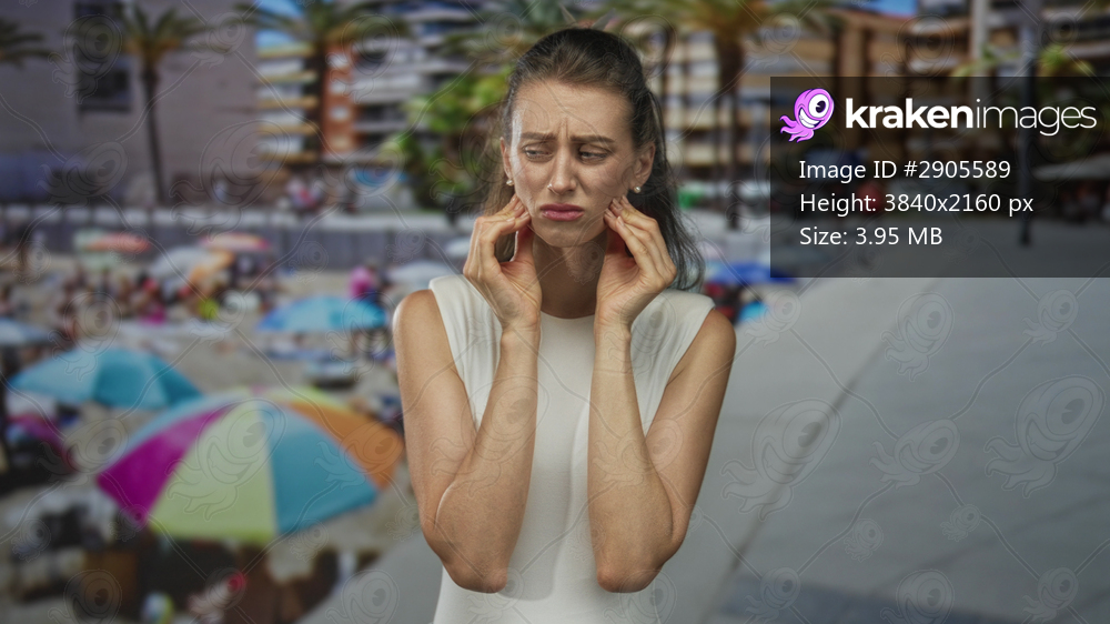Young woman pressing cheeks with hands for toothache on crowded beach promenade under colorful umbrellas; toothache pain.