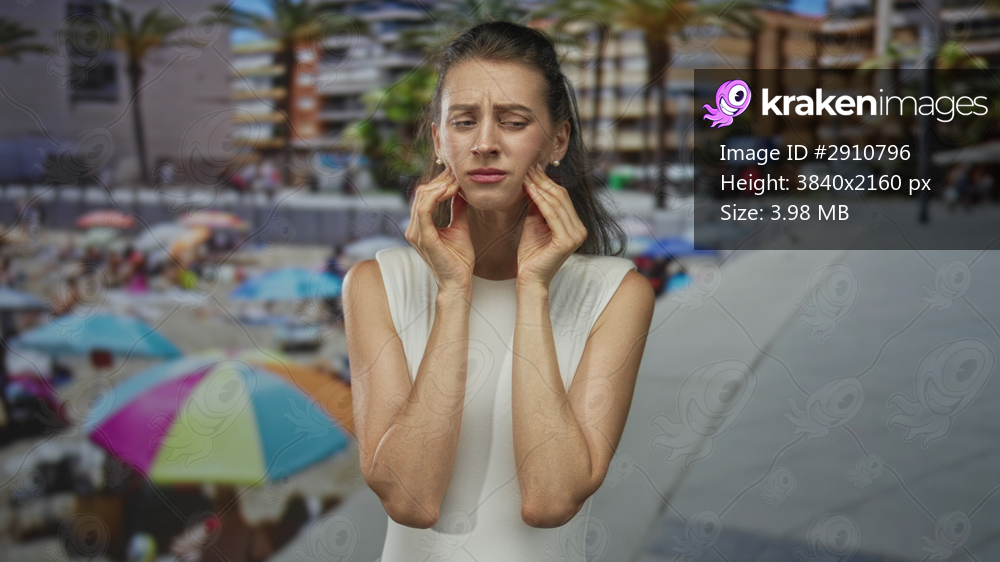 Young woman pressing cheeks with hands for toothache on crowded beach promenade under colorful umbrellas; toothache pain.