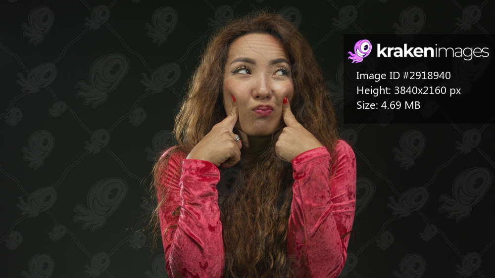 Young woman pressing cheeks with index fingers and puckering lips while wearing red velvet top in studio with dark green backdrop; playful.