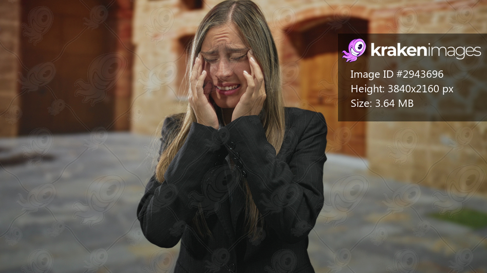 Young woman pressing hands to face and squinting eyes while crying in front of a stone building entrance with wooden doors and paved courtyard; loss distress. - Kraken Images
