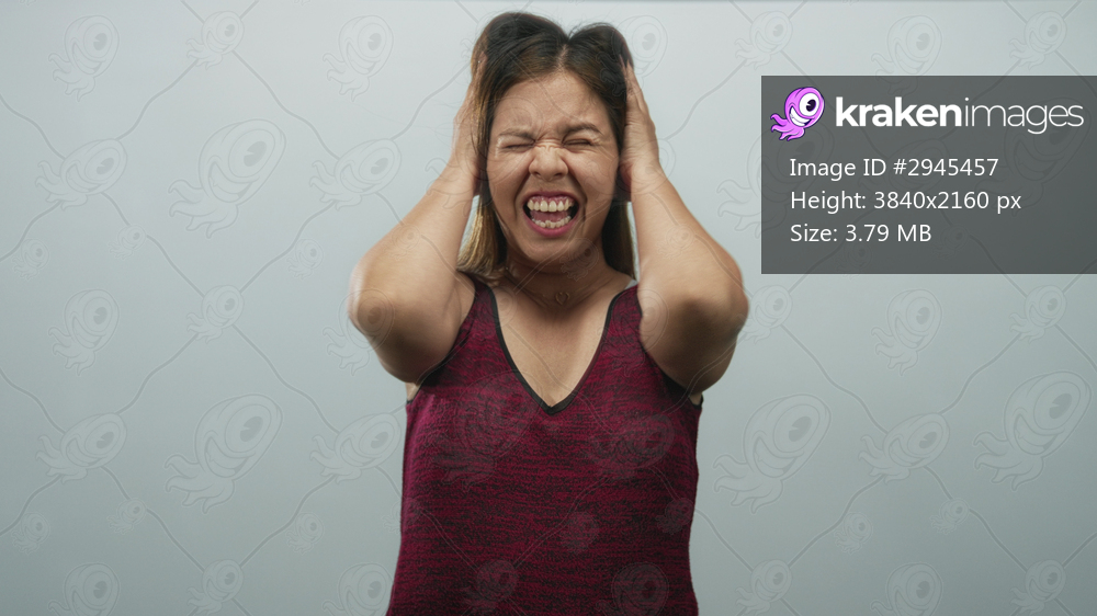 Young woman pressing hands to head and covering ears in a studio with a pale gray wall wearing a burgundy sleeveless top; frustration.