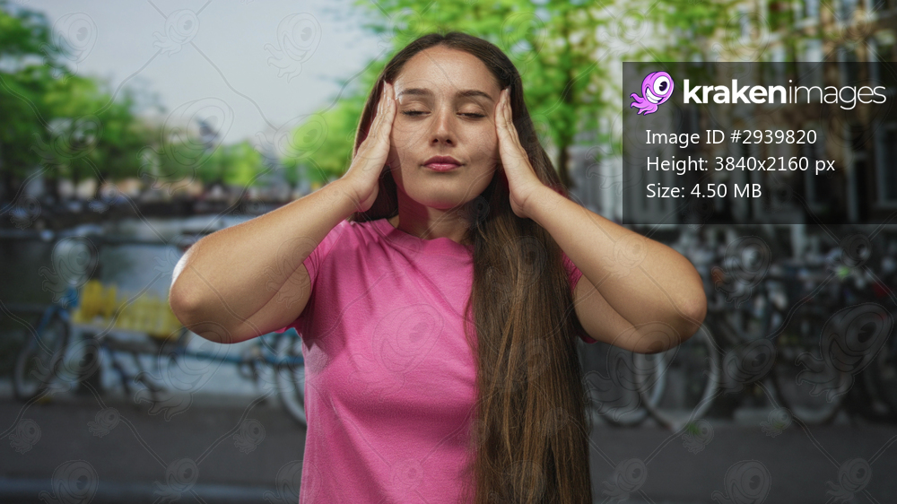Young woman pressing hands to temples with closed eyes on a street in amsterdam by canal and bicycles, showing headache and discomfort; stress fatigue. - Kraken Images