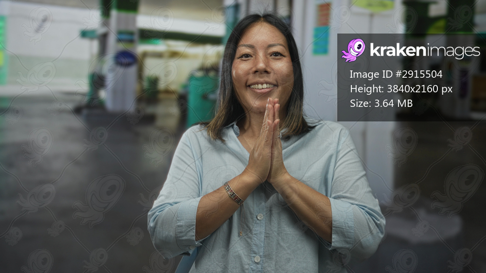 Young woman pressing hands together in namaste gesture with gentle smile at petrol station building near fuel pump; gratitude.