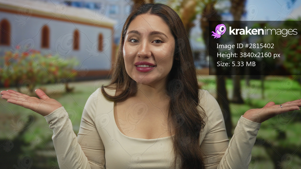 Young woman pressing her index fingertips together in building courtyard with palm trees; contemplation.