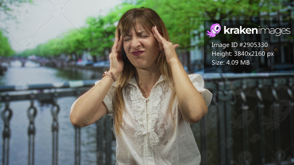 Young woman pressing temples with both hands on a street bridge over a canal in amsterdam; headache distress.