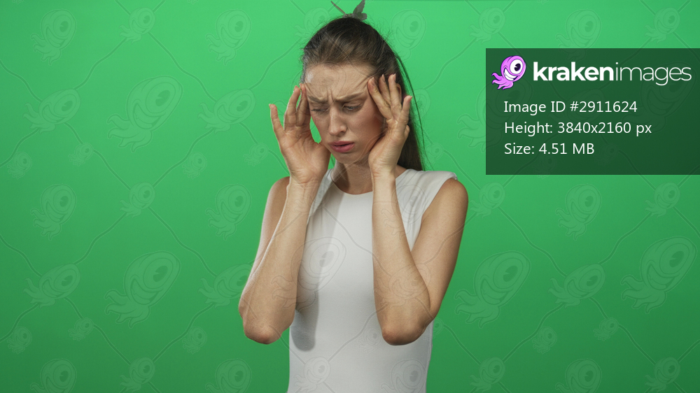 Young woman pressing temples with hands, grimacing and eyes closed in studio green backdrop under soft lighting; stress discomfort.