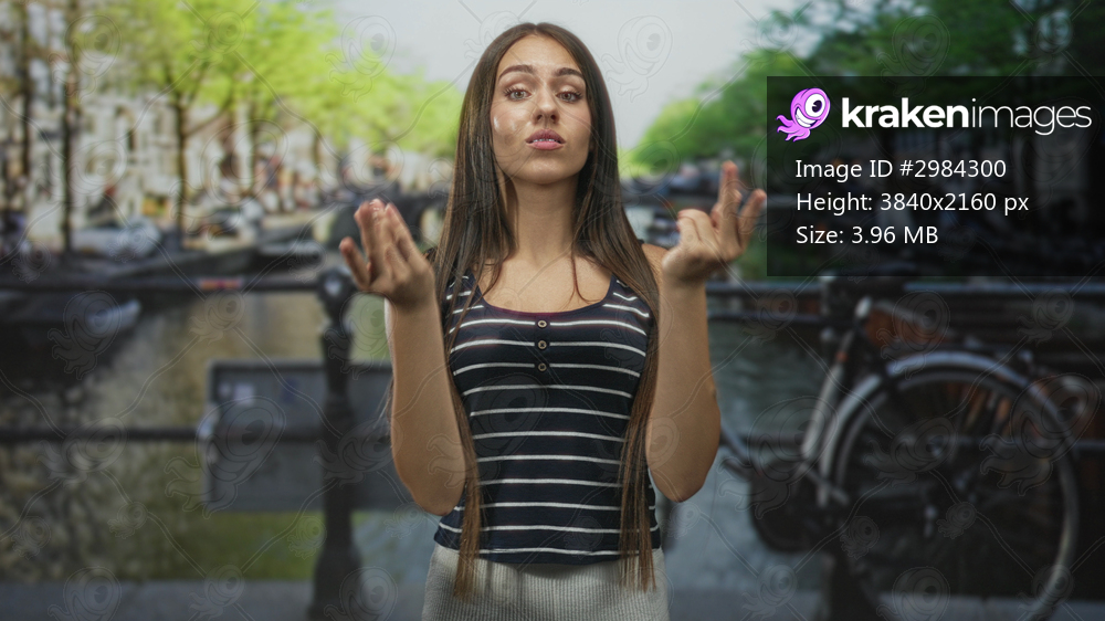 Young woman puckering lips and blowing a kiss with hands visible on a street bridge by a canal; playful confidence.