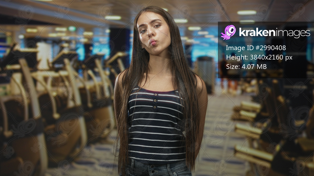 Young woman puckers lips with hands behind back in a gym building lined with treadmills and blurred exercisers; playful youth.