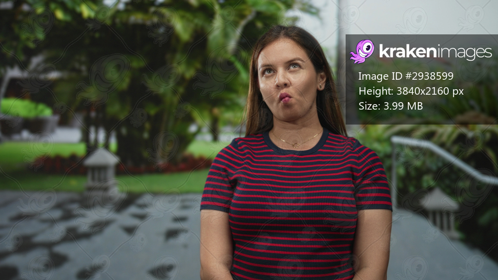 Young woman puckers lips in a striped top on a street lined with tropical plants and stone path; playful curiosity.