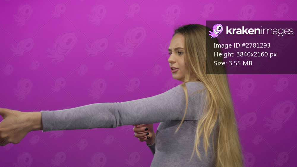 Young woman pulling imaginary rope against pink wall isolated in studio, showcasing playful interaction and exercise concept.