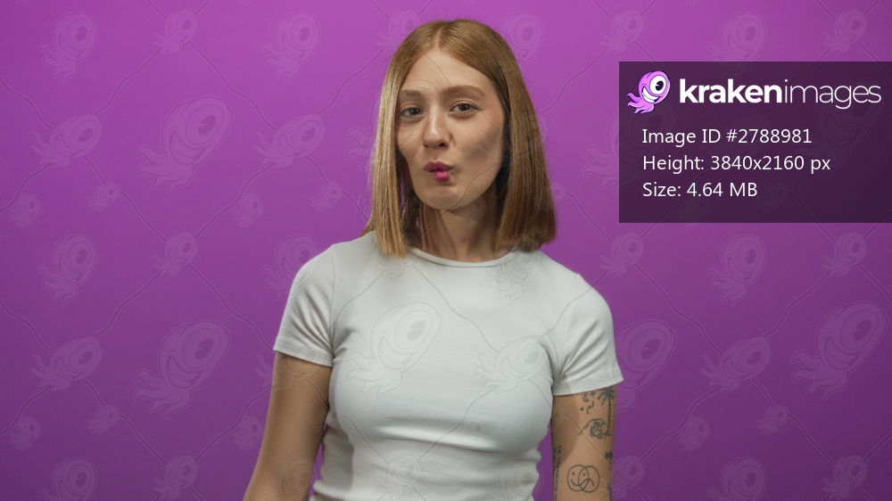 Young woman pursing lips for a funny face in a bright photo studio setting; playfulness joy silliness humor.
