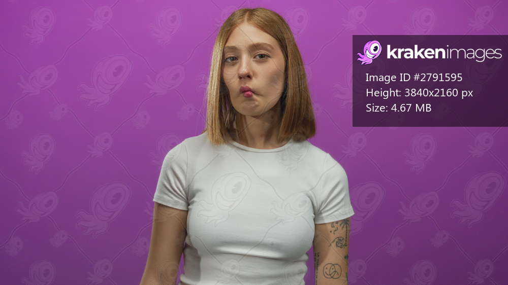 Young woman pursing lips for a funny face in a bright photo studio setting; playfulness joy silliness humor.