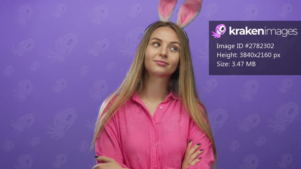 Young woman with rabbit ears posing confidently against an isolated purple background, wearing a vibrant pink shirt, embodying a playful and festive easter theme. - Kraken Images
