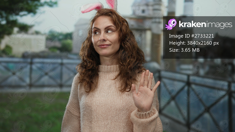 Young woman with rabbit ears smiling outdoors near historic roman ruins, wearing a sweater, with roman architecture in the background, blending fun and history. - Kraken Images