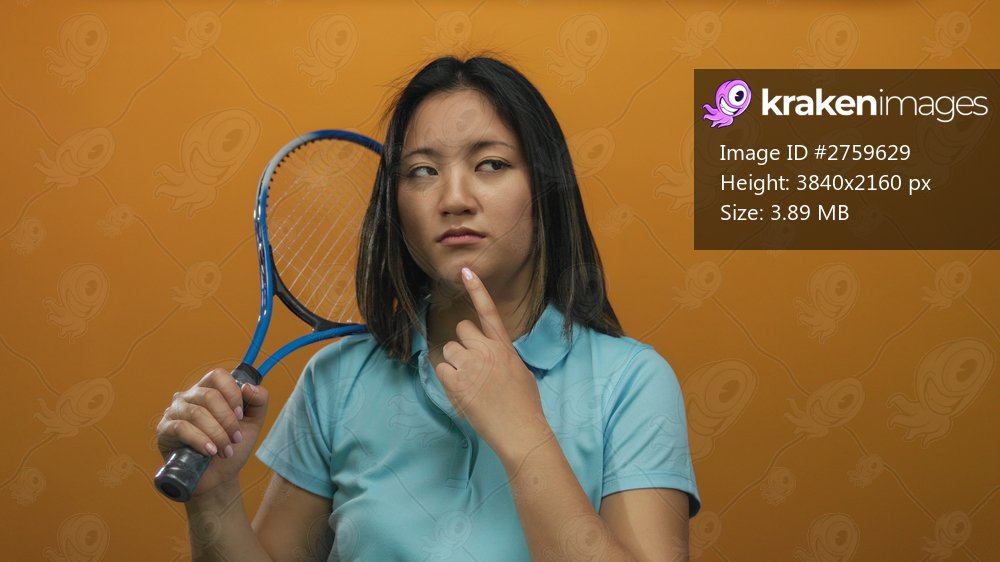 Young woman with racket pondering in front of an orange wall background, presenting a unique blend of sport and contemplation.
