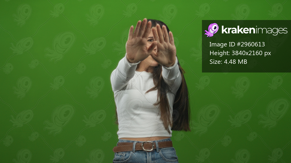 Young woman raises hand in a stop gesture and covers her face with the other hand in a studio; shyness privacy.