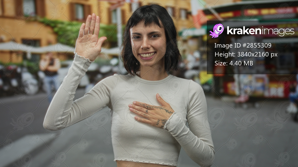 Young woman raises hand and places hand on chest on street lined with shops and scooters; sincerity trust.