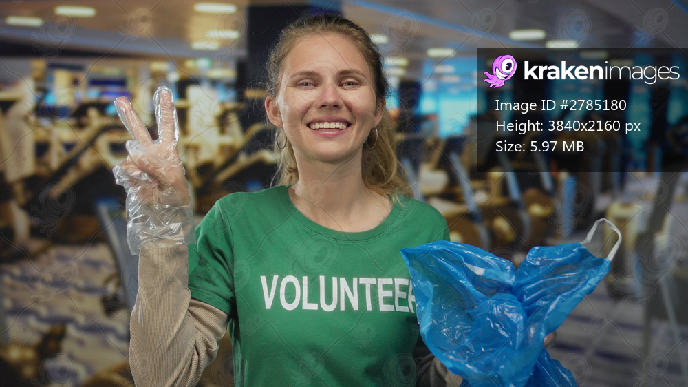 Young woman raises hand to show peace within gym as volunteer wearing glove holds bag while smile frames face near treadmill promoting fitness.