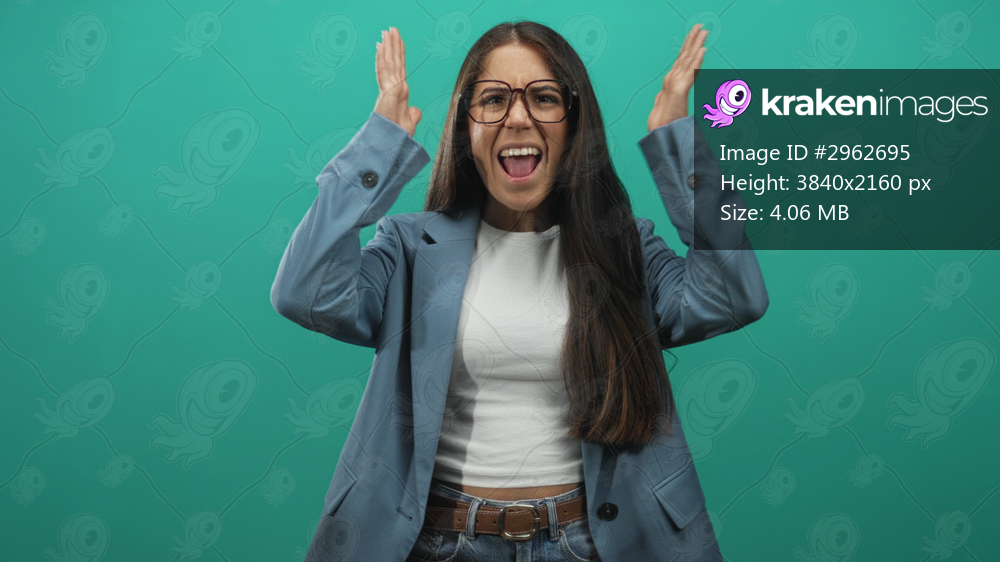 Young woman raises hands to head, mouth open and wearing glasses with visible hands and belt in teal studio; surprise.