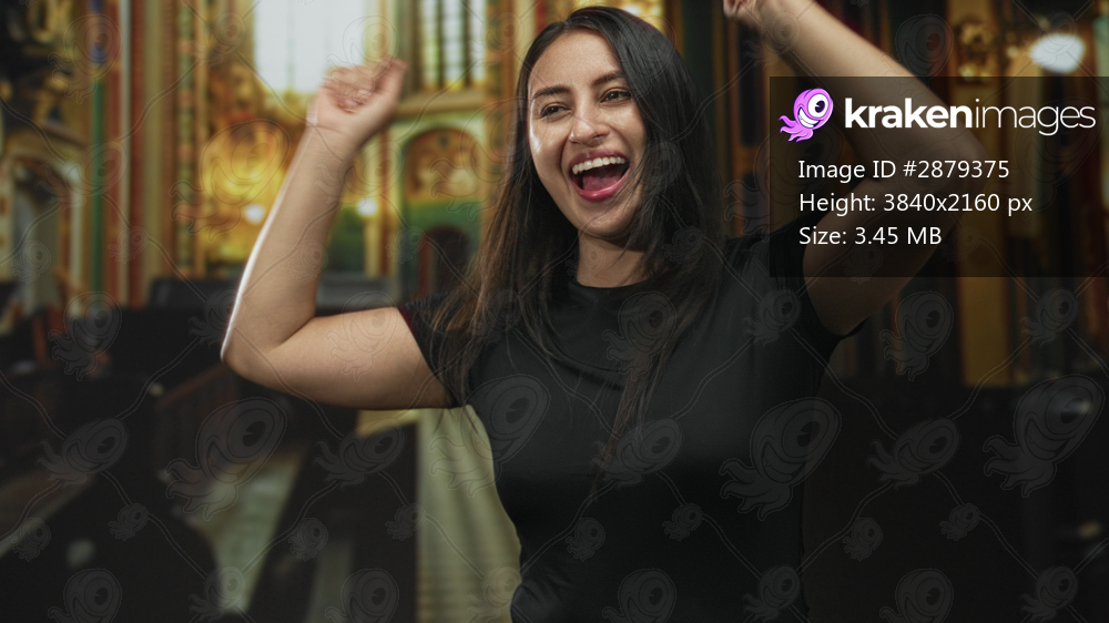 Young woman raises her arms and smiles inside a church building while wearing a black shirt and showing bare arms; spiritual joy.