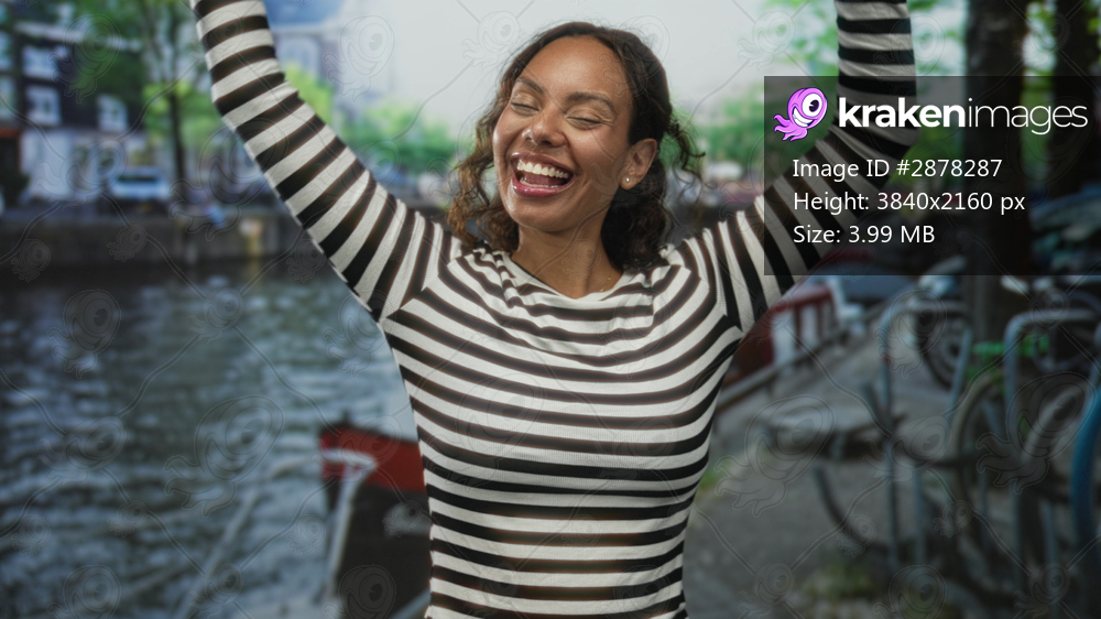 Young woman raising arms and smiling toward camera by amsterdam canal with bicycles and bridge on street; joy celebration.