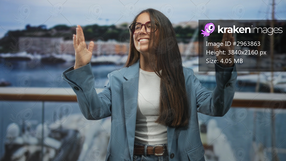 Young woman raising both hands with palms visible and smiling on a building balcony, wearing glasses and blazer; joyful optimism.