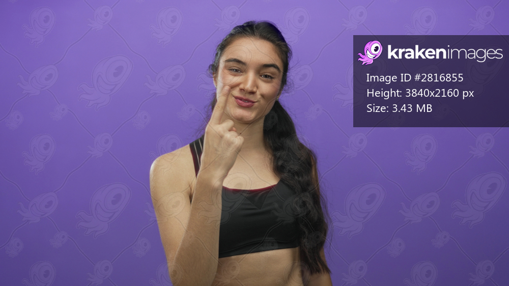 Young woman raising three fingers and making a celebratory fist gesture in purple studio; success joy empowerment.
