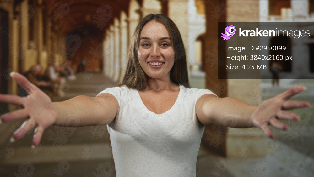 Young woman reaches arms forward with bare hands in building corridor smiling to camera; joyful welcome.