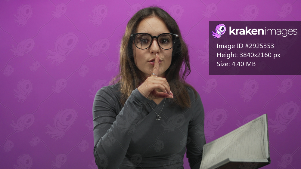 Young woman reading a notebook and pointing with hand in studio against a purple backdrop; study contemplation.