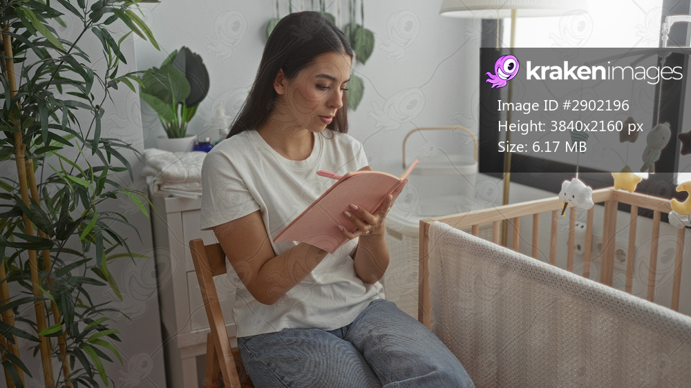 Young woman reading a pink notebook by a wooden crib in a nursery building, hand on chin gesture; calm planning.