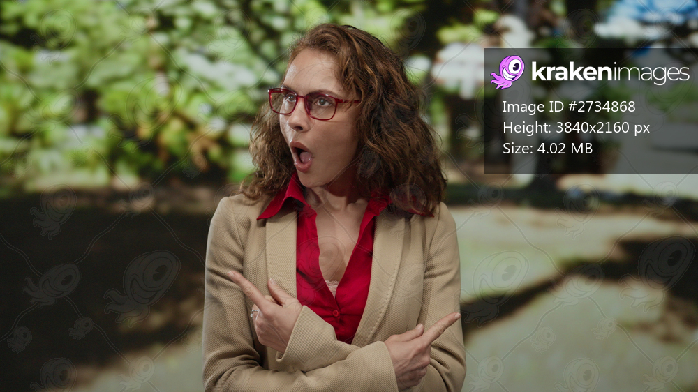 Young woman with red glasses expressing excitement and positivity with thumbs up in a sunny park setting surrounded by lush green backdrop implying outdoor leisure. - Kraken Images