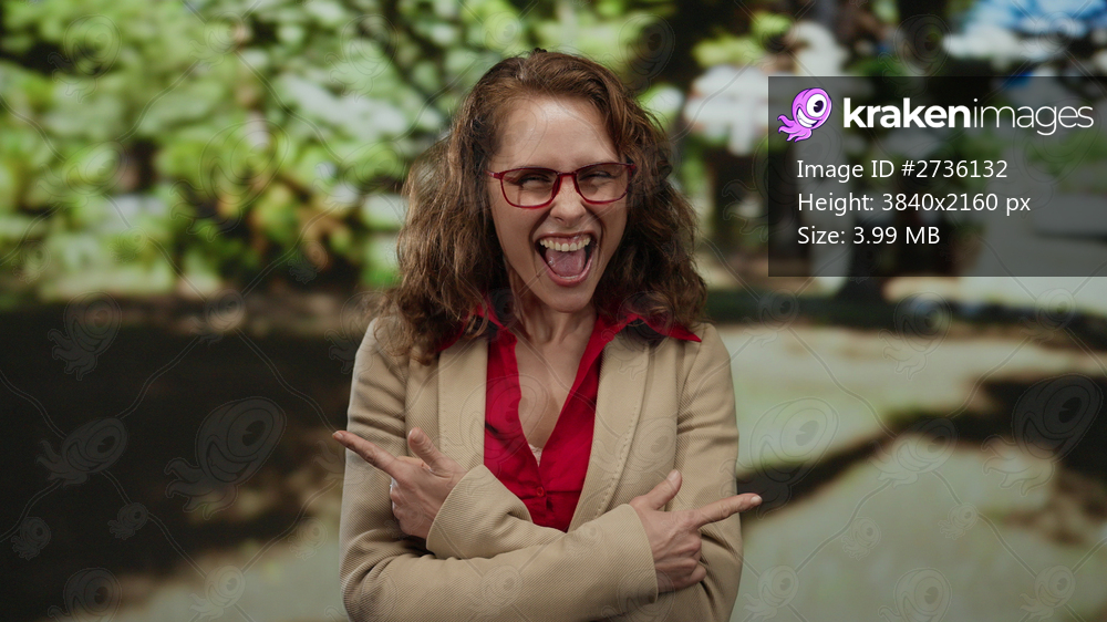 Young woman with red glasses expressing excitement and positivity with thumbs up in a sunny park setting surrounded by lush green backdrop implying outdoor leisure. - Kraken Images