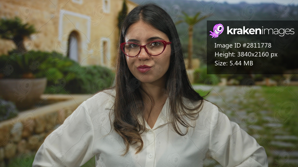 Young woman with red glasses points finger to head and camera in outdoor building; thinking intelligence confidence.