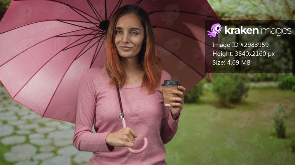 Young woman with red hair holding a takeaway coffee cup and gripping a pink umbrella handle while smiling on a forest stone path; serenity.