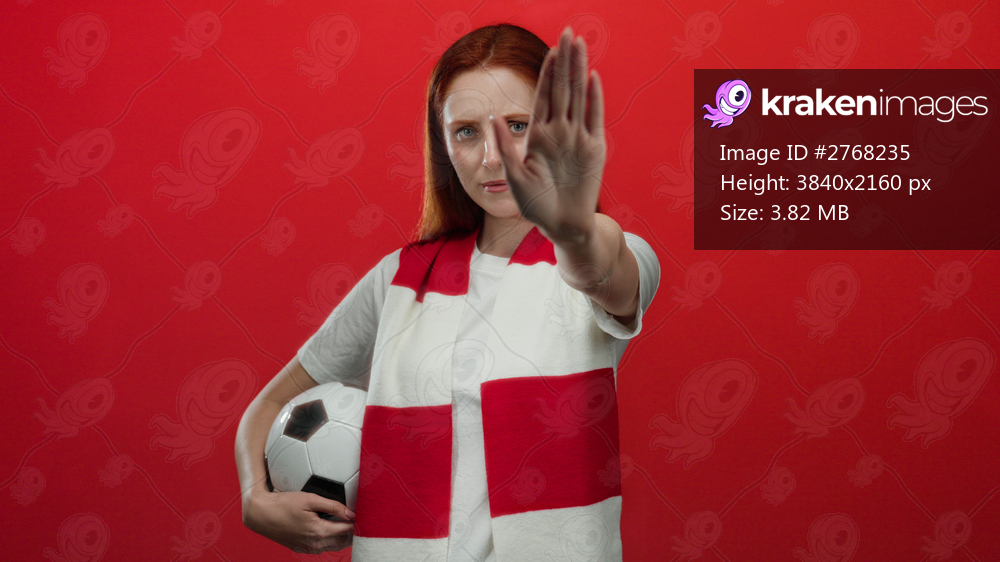 Young woman with red hair holds soccer ball and gestures stop against red wall, wearing england scarf showing determination and focus