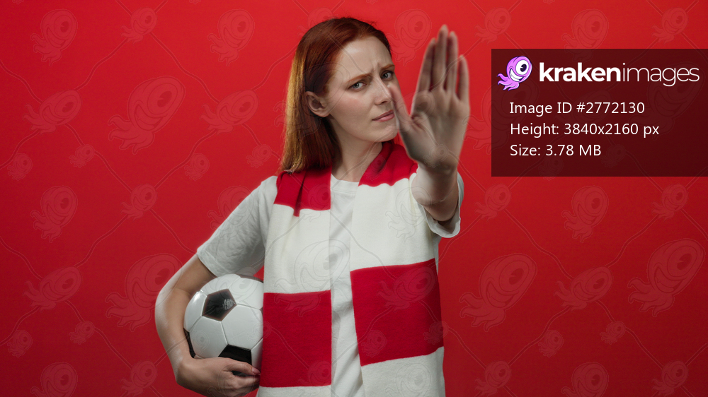 Young woman with red hair holds soccer ball and gestures stop against red wall, wearing england scarf showing determination and focus