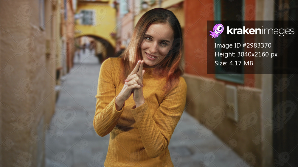 Young woman with red hair making a finger gun gesture with hands and fingers in a narrow cobbled street archway; playful confidence.