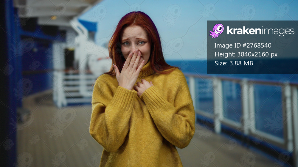 Young woman with red hair on a boat at sea wearing a yellow sweater, displaying emotion in a scenic seaside setting with a clear sky in the outdoor background. - Kraken Images