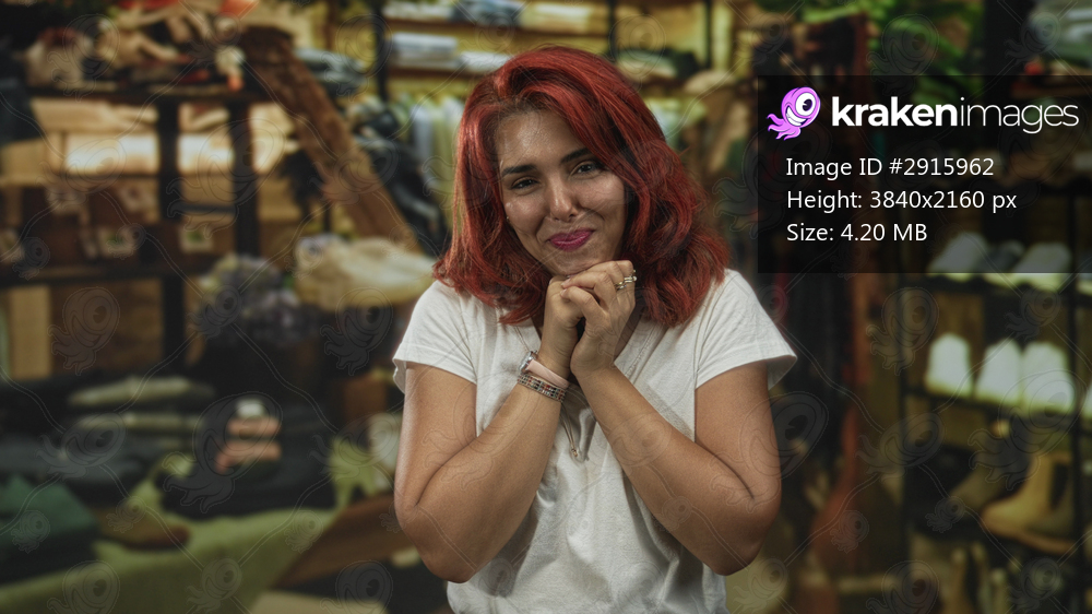 Young woman with red hair smiling and hands clasped to chin while wearing white tshirt in a clothing store building; warmth joy.