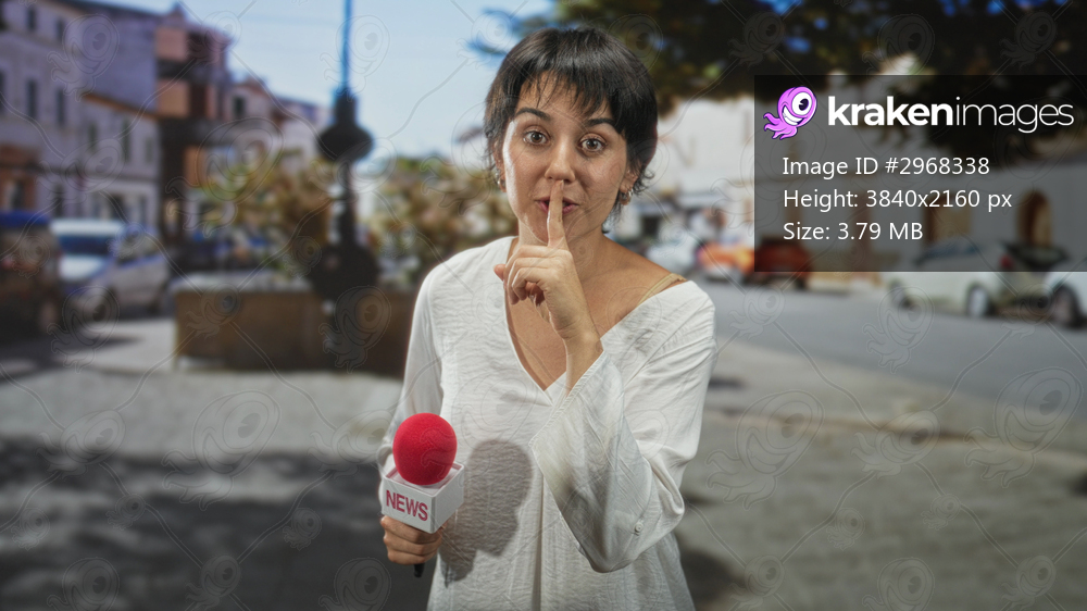 Young woman with red news microphone holds index finger to lips for silence while reporting on a sunlit street lined with parked cars; secrecy quiet.