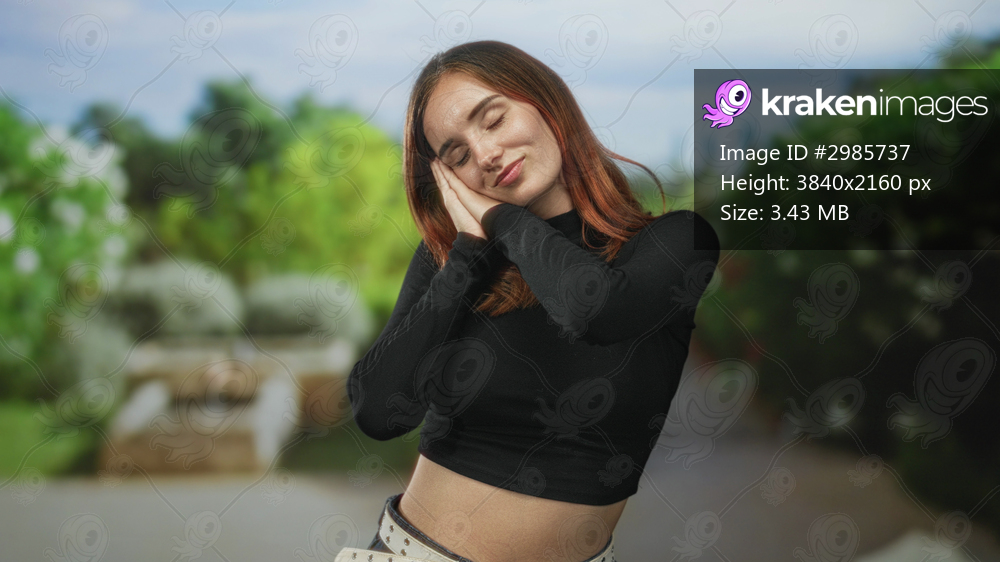 Young woman redhead cups hands to cheek beside a garden fountain on a leafy path, eyes closed, wearing black crop top and studded belt; serene rest.