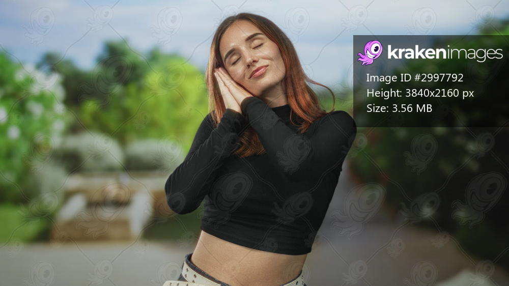 Young woman redhead cups hands to cheek beside a garden fountain on a leafy path, eyes closed, wearing black crop top and studded belt; serene rest.