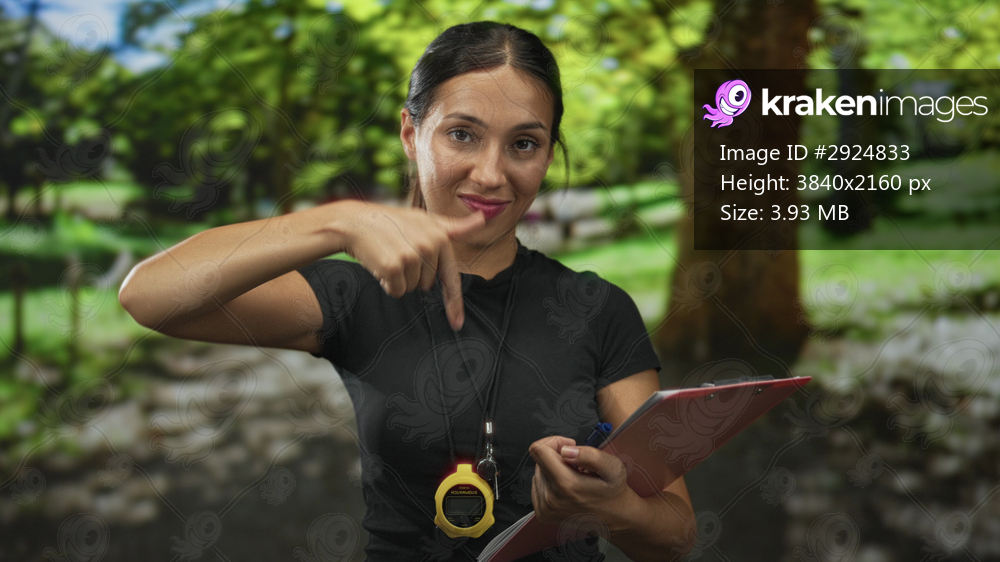 Young woman referee points finger down while holding stopwatch and clipboard in park; training authority.