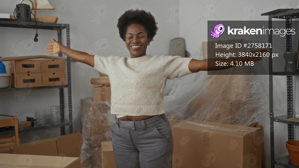 Young woman rejoicing in modern living room surrounded by unpacked boxes denotes new beginning and excitement within her urban apartment environment.