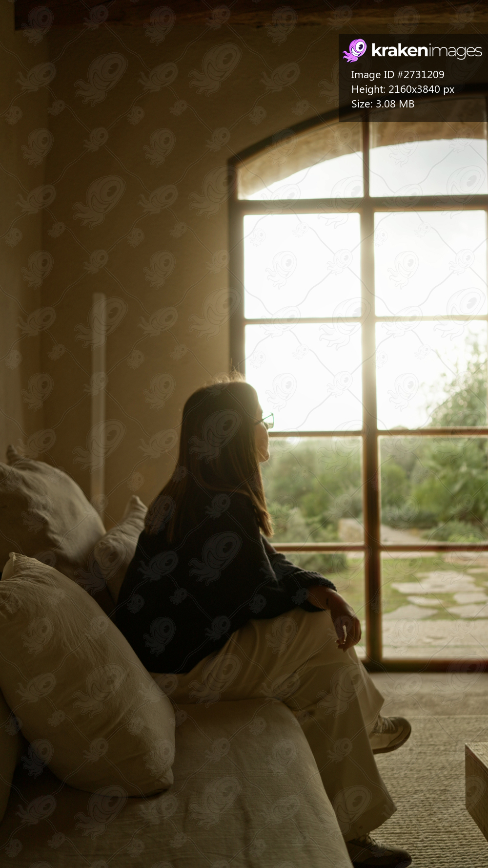 Young woman relaxing indoors in a mediterranean house with large windows overlooking a garden, seated on a comfortable sofa, enjoying the tranquil and serene ambiance of her home. - Kraken Images
